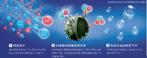 夏普空氣凈化器搭載獨有的“凈離子群”空間凈化技術,這項技術通過等離子放電產生出與自然界相同的正負離子,僅當附著在霉菌或病毒表面時,才形成強氧化力的OH基,從表面的蛋白質中瞬間抽取出H,分解蛋白質。OH基與H基結合,形成水返回到空氣中。