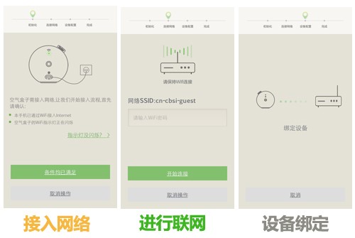 當然,空氣盒子的使用離不開無線局域網。當初次使用空氣盒子時,其背部的WIFI指數燈會一直閃爍,當手機注冊登錄,連接的所在室內的無線局域網時,空氣 盒子就會自動匹配,當需要重置無線網絡時,只需按重置鍵,看見WIFI指數燈快速閃爍三下,就說明完成重置操作,即可進行登入用戶網絡連接操作。