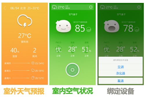 海爾空氣盒子除了可以將家中的空調、空氣凈化器等多款家電進行互聯和控制外,還可以智能檢測空氣質量,及時的告知用戶天氣狀況等人性化同時更貼心的服務,讓 消費者通過這個“空氣盒子”,無限、智能、便捷的聯動家中的空氣設備,讓用戶可以實現利用手機等移動終端進行遠程遙控。