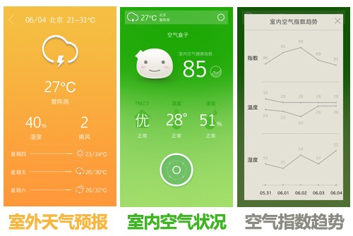 當上述的所有操作都完成以后,就可進入空氣盒子APP客戶端界面,進行室內空氣健康情況的查看,而空氣盒子則會對室內的溫度、濕度、PM2.5健康情況以 及室內整體的健康指數進行時時的檢測,當室內空氣混濁,有害氣體超標時,其就會自動的發出警報,提醒用戶開窗或是開空調、開空氣凈化器,來及時的對室內空 氣進行有效凈化,智能推送與操作,輕松搞定。