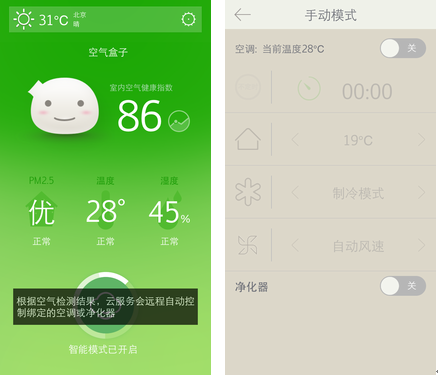 海爾空氣盒子與普通空調、空氣凈化器組合,即可變成智能家電,遠程APP智能控制一步到位。用戶可通過App對空調:開啟、關閉、設定 模式、溫度、風速進行調控。用戶可通過App對空氣凈化器:開啟、關閉,遠程操作。